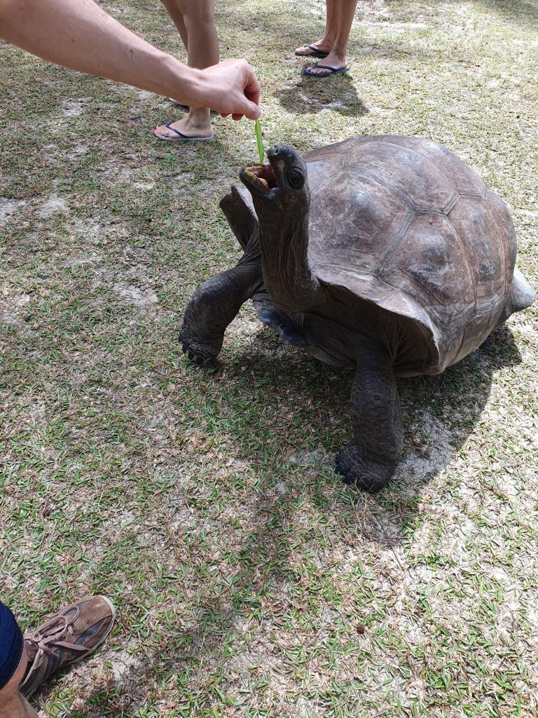 Der Ausflug zu den Schildkröten nach Curieuse war für uns ein Pflichtprogramm. Wir hatten einen Ausflug mit BBQ am Strand und anschließendem Schnorcheln auf St. Pierre gebucht. Bei bestem Wetter ging es schon morgens um 9 Uhr vom Strand Côte d`Or los. Zuerst wurden wir mit dem Boot nach Curieuse zu den Schildkröten gefahren. Hier konnten wir die Tiere ausgiebig füttern und streicheln. Ein unvergessliches Erlebnis.
