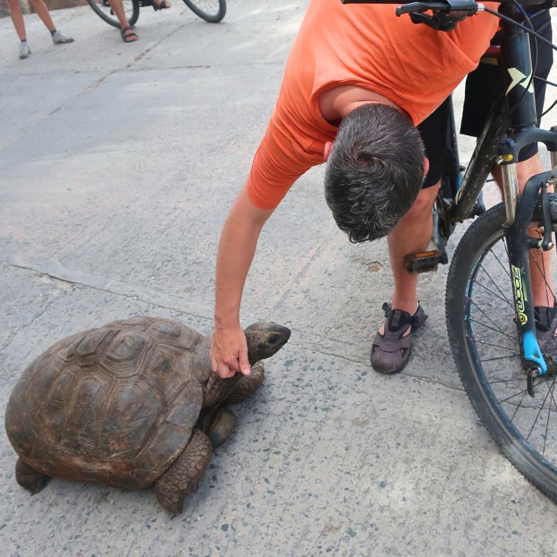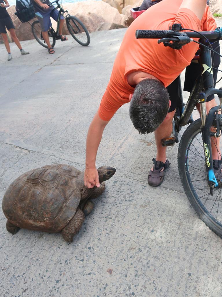 Ein Highlight auf LaDigue war, als uns bei einer Fahrradtour eine frei laufende Schildkröte über den Weg lief. Diese wollte natürlich auch erst mal gestreichelt werden.