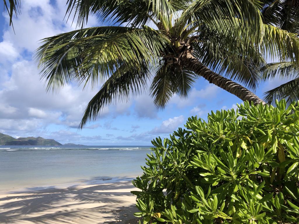 Der Strand von Anse La Réunion war nur ca. 20 Meter von unserem Bungalow entfernt. Strand vom Hotel La Digue Island Lodges