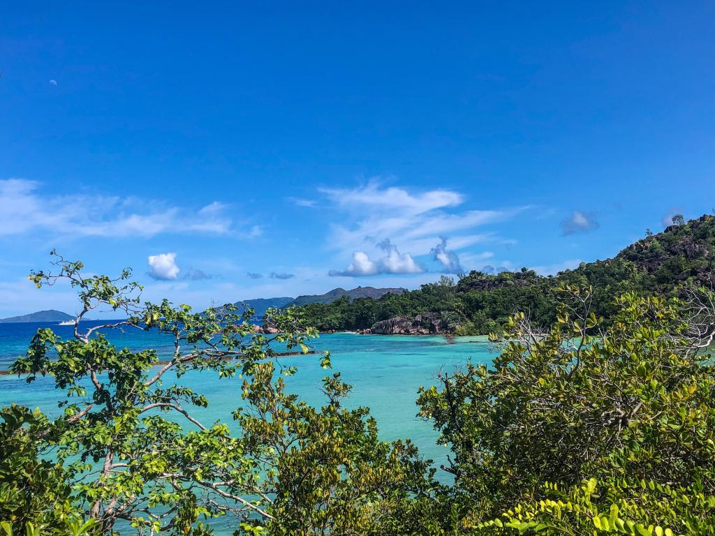 Unser Boot holte uns gegen 15 Uhr an der anderen Seite der Insel ab. Eine kleine Wanderung zum Strand Anse St. Jose führte uns durch Mangrovenwälder und traumhafte Aussichtpunkte mit Weitblick über die Insel. Ausblick von Insel Curieuse