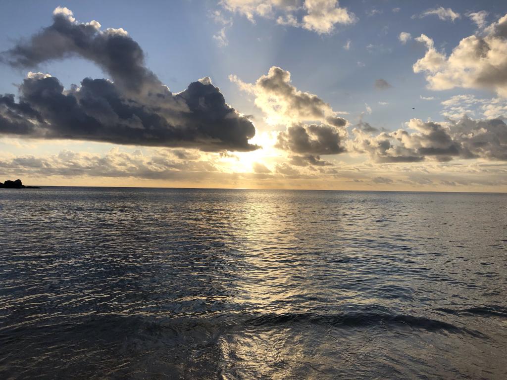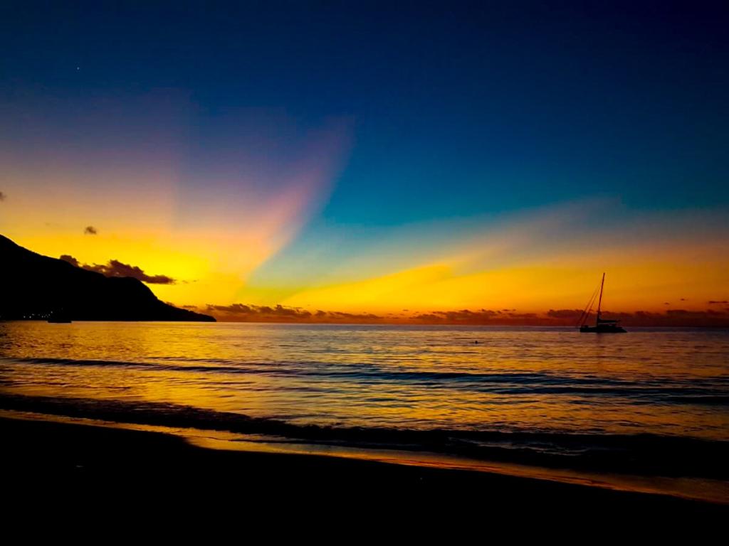 Es ist ein modernes und sauberes Cityhotel. Auf Mahé besuchten wir als erstes den „berühmten“ Strand Beau Vallon. Dieser Strand ist wohl der belebteste Strand der Seychellen mit einer 3 km langen Bucht und zahlreichen Cafés, Restaurants und Take Away Stationen. Hier suchten wir uns etwas abseits ein ruhiges Plätzchen und erlebten einen wunderschönen Sonnenuntergang mit Blick auf die Insel Silhouette.Sonnenuntergang Beau Vallon