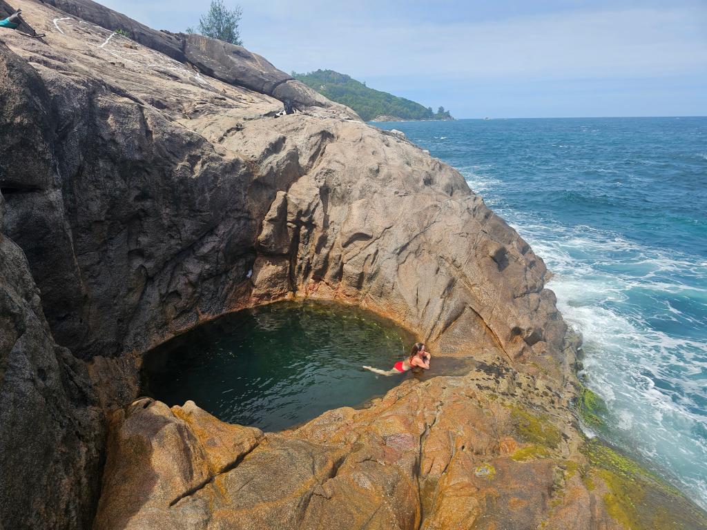 Weiter ging es dann auf die größte Insel Mahé. Hier war alles wieder etwas schneller und belebter. Empfangen von einem wunderschönen Sonnenuntergang und leckeren Drinks ließ es sich aber auch hier ganz gemütlich leben. Mit unserem Mietauto „Karl“ erkundeten wir die Insel mit ihren unzähligen Stränden. Unser Highlight war dabei die Anse Soleil, eine kleine friedliche Bucht mit einem traumhaften Strand. Am nächsten Tag machten wir uns auf einen abenteuerlichen Weg durch den Dschungel, um einen kleinen Rock Pool zu finden, und das war gar nicht so einfach. Nach einigen Umwegen und vielen Schweißperlen gelang es uns, den Pool zu finden. Wir waren ganz alleine an diesem Ort und es war einfach traumhaft. Einer unserer Lieblingsmomente hier auf Mahé.