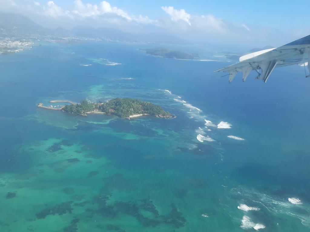 Unseren Urlaub auf den Seychellen haben wir schon Monate vorher gebucht. Uns war es wichtig, zuerst ein paar ruhige Tage an einem idyllischen Ort zu verbringen, weshalb wir uns als erste Destination die Unterkunft Chauve Souris Relais ausgesucht haben – eine kleine Anlage auf einer Privatinsel 300 Meter von der Küste Praslins entfernt. Nach einer anstrengenden Flugreise wurden wir von einem Mitarbeiter von Creole Travel Services (dem Vor-Ort-Partner von Seyvillas) am Flughafen auf Mahé empfangen und erhielten erste Infos. Für die Weiterreise nach Praslin haben wir einen Flug mit der Seychelle Air gebucht – gleich zu Beginn unseres Urlaubs ein kleines Highlight, das uns erste wunderbare Aussichten auf die Inseln bot.