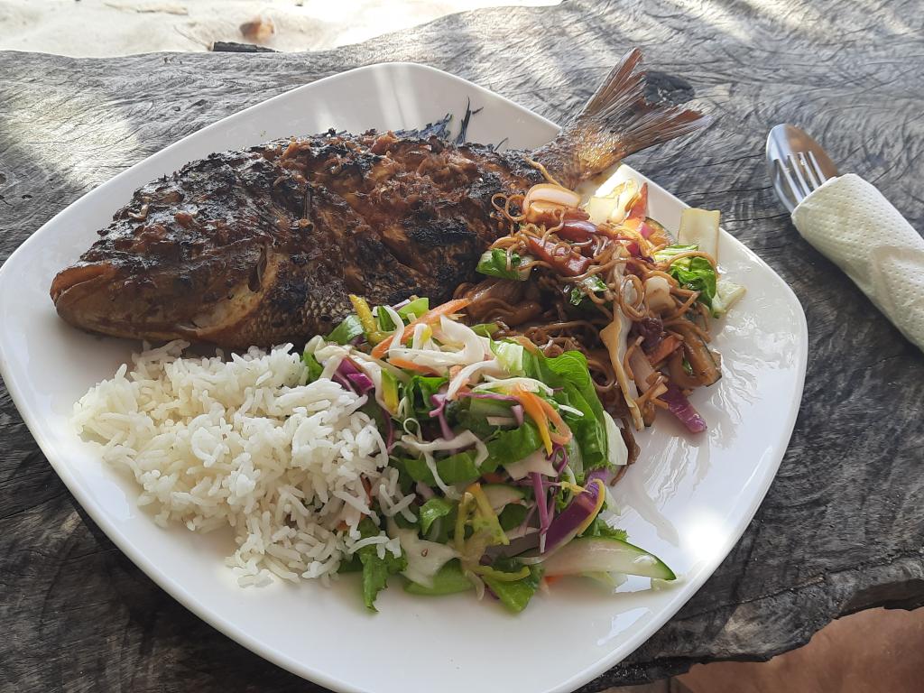 Ein weiteres Highlight der Seychellen-Reise erlebten wir dann am Nachmittag. Wir radelten vom Hotel Patatran südwärts, stellten dort die Räder ab und folgten einem Pfad südwärts bis zur Caiman Beach Bar. Der Pfad war sensationell. Zwischen den Granitfelsen wurden liebevoll Brücken und Leitern aus Holz angebracht, sodass man den Pfad relativ problemlos begehen konnte. Es machte richtig Spaß, über die Felsen zu kraxeln. Da diese Bar sehr einsam liegt, war nur sehr wenig los. Ein Koch bereitete uns einen frischen Fisch zu, den wir uns mit Blick auf die Anse Caïman