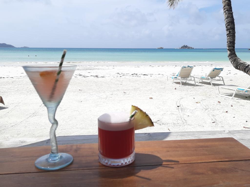 Zurück ging es dann mit dem Bus. Busfahren auf den Seychellen ist sehr günstig – man muss aber viel Zeit und Geduld mitbringen. Fahrpläne sucht man vergebens. Und das Fahren in einem überfüllten Bus darf einen auch nicht stören. Wieder zurück an der Anse Volbert (Cote d'Or) gönnten wir uns einen Cocktail im angesagten Café des Arts mit wunderbarem Blick auf das Meer und „unsere“ Insel.