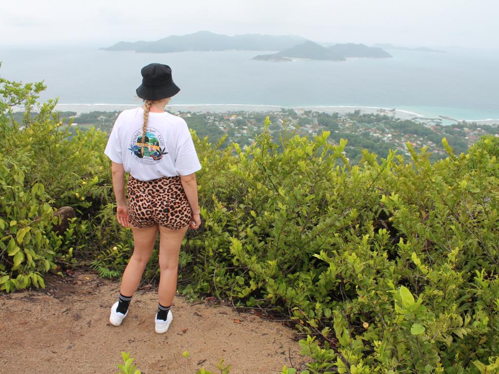 Am dritten Tag war es sehr bewölkt und regnerisch. Kein Wunder aufgrund der momentanen Regenzeit. Trotzdem war die Sicht auf den höchsten Berg auf La Digue klar und wir entschieden uns, die Wanderung zum Nid d'Aigle zu machen. Am Vormittag starteten wir zu Fuß von La Passe aus und folgten der gut beschilderten Wanderroute. Bis zur Belle Vue ist es ein steiler Weg auf befestigter Straße. Im Anschluss führt ein kleiner unscheinbarer Wanderweg über Treppen, Felsen, Wurzeln, einer Leiter und durch Pflanzen hinauf bis zur Aussichtsplattform. Hier sollte man unbedingt festes Schuhwerk tragen. Die Aussicht über La Digue bis zu den Nachbarinseln belohnt dann aber definitiv den anstrengenden Aufstieg. Auf dem Rückweg legten wir noch eine Pause in der bereits erwähnten Bar ein. Auch von der Terrasse aus hat man eine atemberaubende Sicht über die Insel.